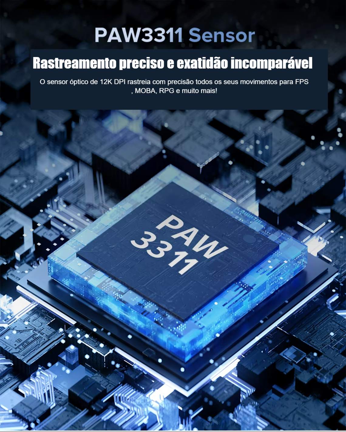 🧠 Sensor profissional Pixart 3311: o mesmo usado em mouses de alto desempenho.